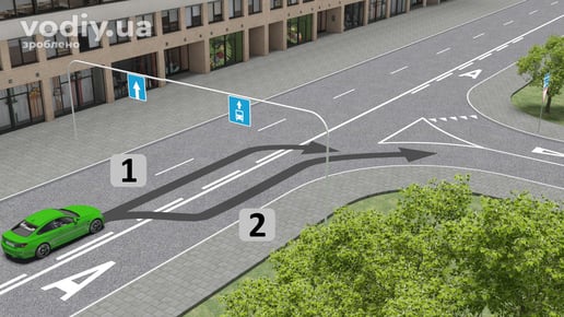 Виїжджаючи на дорогу, що має смугу для руху маршрутних транспортних засобів водій повинен триматися правіше, тобто виконати поворот за траєкторією «2».