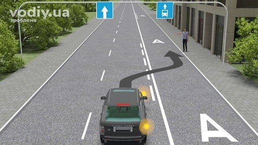 У наступному випадку, водієві дозволяється виконати перестроювання лише для повороту. Продовжити рух прямо по смузі для маршрутних транспортних засобів забороняється.