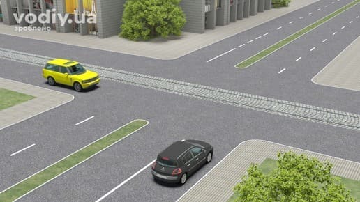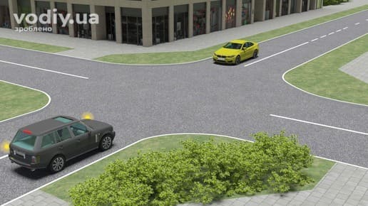 В наступному випадку, на нерегульованому перехресті водій жовтого автомобіля виконав вимоги ПДР і зупинився перед краєм перехрещуваної проїзної частини для надання переваги чорному автомобілю.