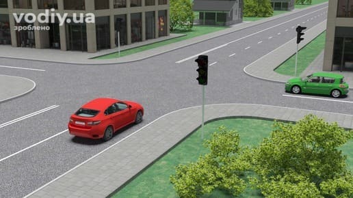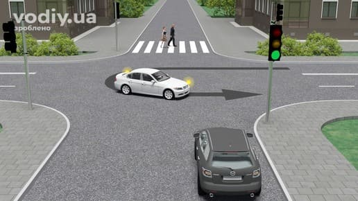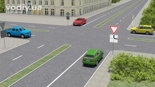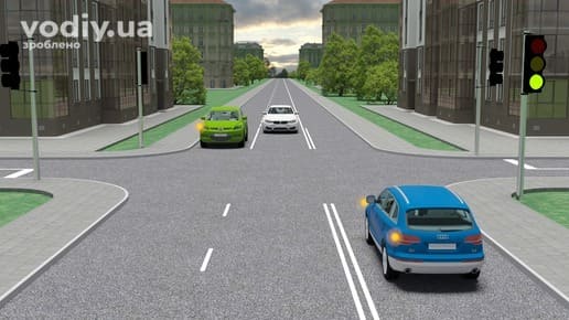 На наступному перехресті водій синього автомобіля має керуватись лише сигналами світлофора (знаки пріоритету при працюючому світлофорі не діють). Водій зеленого автомобіля має намір виконати поворот ліворуч, а тому повинен дати дорогу синьому автомобілю перед виконанням маневру.