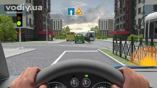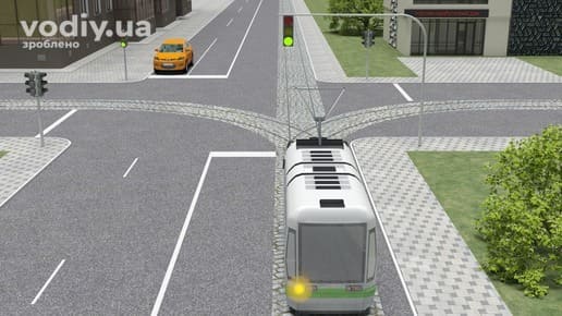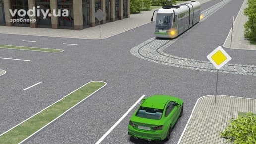 Водій автомобіля і трамвай рухаються назустріч один одному на зелений сигнал світлофора. Трамвай має перевагу руху, попри те, що повертає ліворуч.
