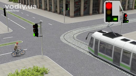 Зверніть увагу, якщо трамвай рухається на сигнал світлофора включений у додатковій секції, то згідно з вимогами п. 8.7.3 «е» та 16.9 ПДР, він повинен дати дорогу велосипедистові та проїде перехрестя другим.