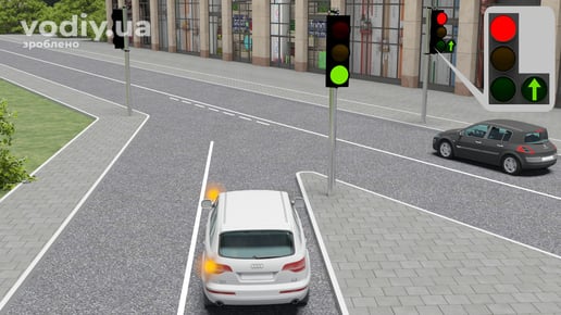 На перехресті, де рух регулюється світлофором з додатковою секцією, водій, який перебуває на смузі, з якої робиться поворот, повинен продовжувати рух у напрямку, що вказує стрілка, ввімкнута в додатковій секції, якщо його зупинка на заборонний сигнал світлофора створить перешкоди транспортним засобам, що рухаються за ним по тій самій смузі.