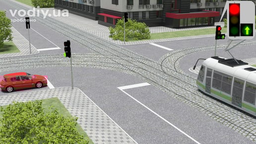 Зверніть увагу, трамвай має перевагу руху лише у рівнозначних умовах. Рухаючись на стрілку у додатковій секції світлофора, він повинен дати дорогу червоному автомобілю.