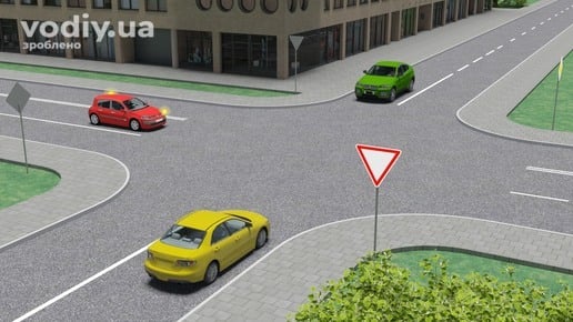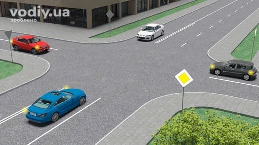 , щоб дати дорогу синьому автомобілю, що рухається головною дорогою.