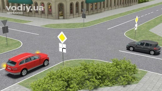 Водії синього та білого автомобілів рухаються головною дорогою і проїдуть перехрестя першими. Оскільки вони знаходяться у рівнозначних умовах, то першим проїде той, хто рухається прямо (білий автомобіль), а другим – той, хто повертає ліворуч (синій автомобіль). Наступними проїдуть червоний і чорний автомобілі. Перед поворотом ліворуч водій чорного автомобіля повинен дати дорогу червоному, який повертає праворуч.