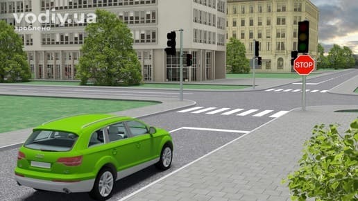 Водій автомобіля рухається на зелений сигнал світлофора. Оскільки при працюючому світлофорі знаки пріоритету не діють, водій повинен керуватись лише сигналом світлофора і проїхати перехрестя без зупинки.