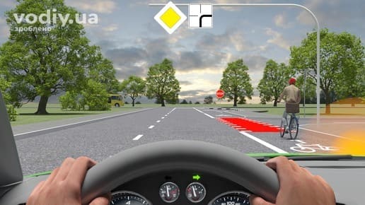 У наступному випадку, перед поворотом праворуч Ви зобов'язані дати дорогу велосипедистові, що рухається у попутному напрямку.