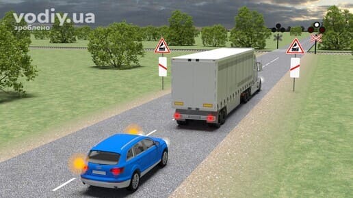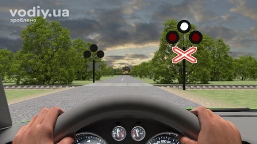 миготливі червоні сигнали забороняють рух транспортних засобів через переїзд; Водій повинен зупинитись перед знаком 2.2