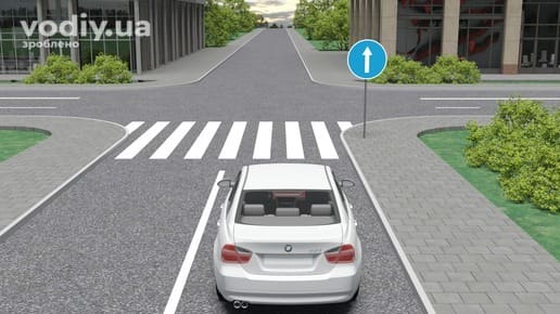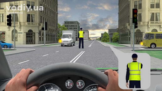 Оскільки пішохід закінчує перехід проїзної частини, водій повинен дочекатись поки той залишить проїзну частину і лише після цього розпочати рух.