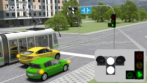 Сигнал у вигляді зеленої стрілки (стрілок) у додатковій (додаткових) секції разом з жовтим або червоним сигналом світлофора інформує водія про те, що рух дозволяється у вказаному напрямку за умови безперешкодного пропуску транспортних засобів, які рухаються з інших напрямків. Чорний автомобіль рухається на зелений сигнал у додатковій секції світлофора, тому він повинен дати дорогу білому автомобілю, який має перевагу руху.