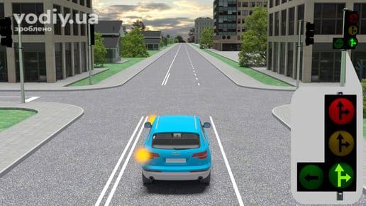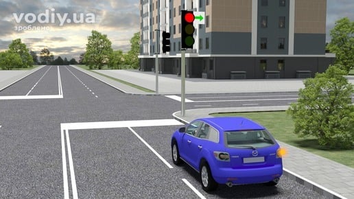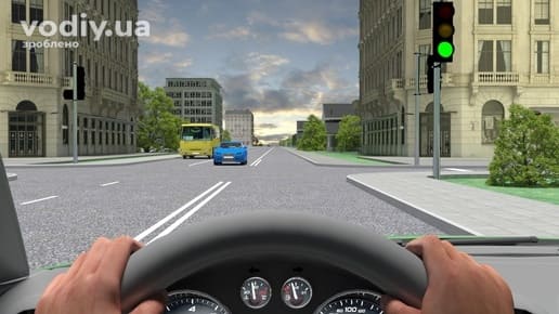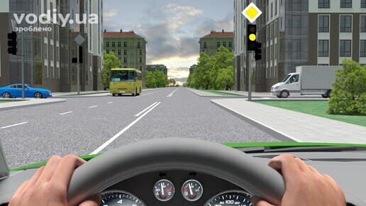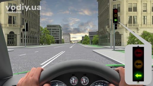 зелений дозволяє рух; На зелений сигнал світлофора Вам дозволено продовжити рух через перехрестя у будь-якому напрямку.