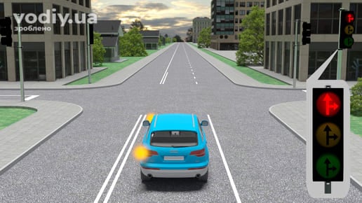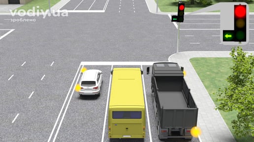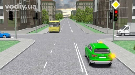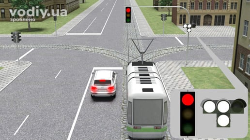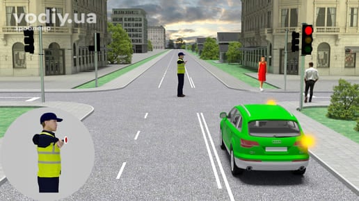 червоний сигнал, у тому числі миготливий, або два червоні миготливі сигнали забороняють рух. Маючи намір продовжити рух через перехрестя, водій зеленого автомобіля повинен дочекатись увімкнення зеленого сигналу світлофора.