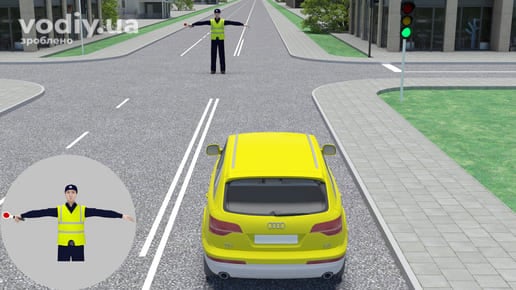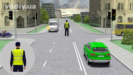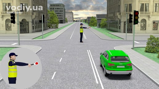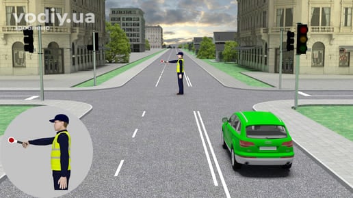 Зелений сигнал світлофора не означає беззастережне право на початок або пріоритет руху. Правилами визначені ситуації, коли водій не може розпочати рух на зелений сигнал світлофора або повинен надати перевагу іншим учасникам перед початком руху. В наступному прикладі рух на зелений сигнал забороняється, оскільки регулювальник подає сигнал, що забороняє рух.