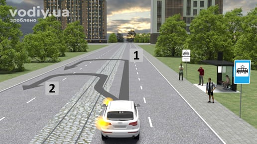 Водієві забороняється виїхати на розділювальну смугу (траєкторія «1»). У разі потреби, він повинен зупинити автомобіль біля правого краю проїзної частини (місце «2»).