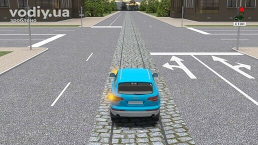 На перехресті дозволяється виїжджати на трамвайну колію попутного напрямку в тих самих випадках, але за умови відсутності перед перехрестям дорожніх знаків 5.16
