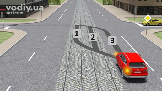 Поворот ліворуч або розворот повинні виконуватися з трамвайної колії попутного напрямку, розташованої на одному рівні з проїзною частиною для нерейкових транспортних засобів, якщо інший порядок руху не передбачено дорожніми знаками 5.16