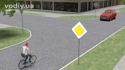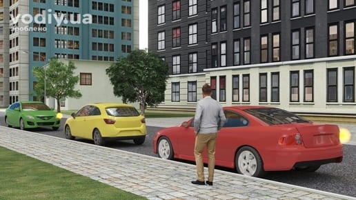 Водії зеленого і червоного автомобілів мають намір почати рух. Водій зеленого автомобіля має перевагу руху.
