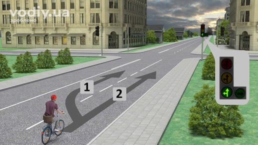 Оскільки ця дорога має дві смуги для руху в одному напрямку і нема потреби виконувати об’їзд іншого транспортного засобу, велосипедистові дозволяється рух лише за траєкторією «2». Поворот ліворуч забороняється.