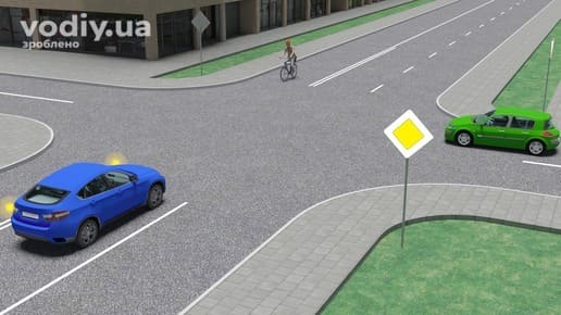 В нашому прикладі, рухаючись по проїзній частині, велосипедист повинен керуватись правилами проїзду нерегульованих перехресть. Керуючись цими правилами, які ми розглянемо у розділі 16 ПДР, він проїде перехрестя першим.